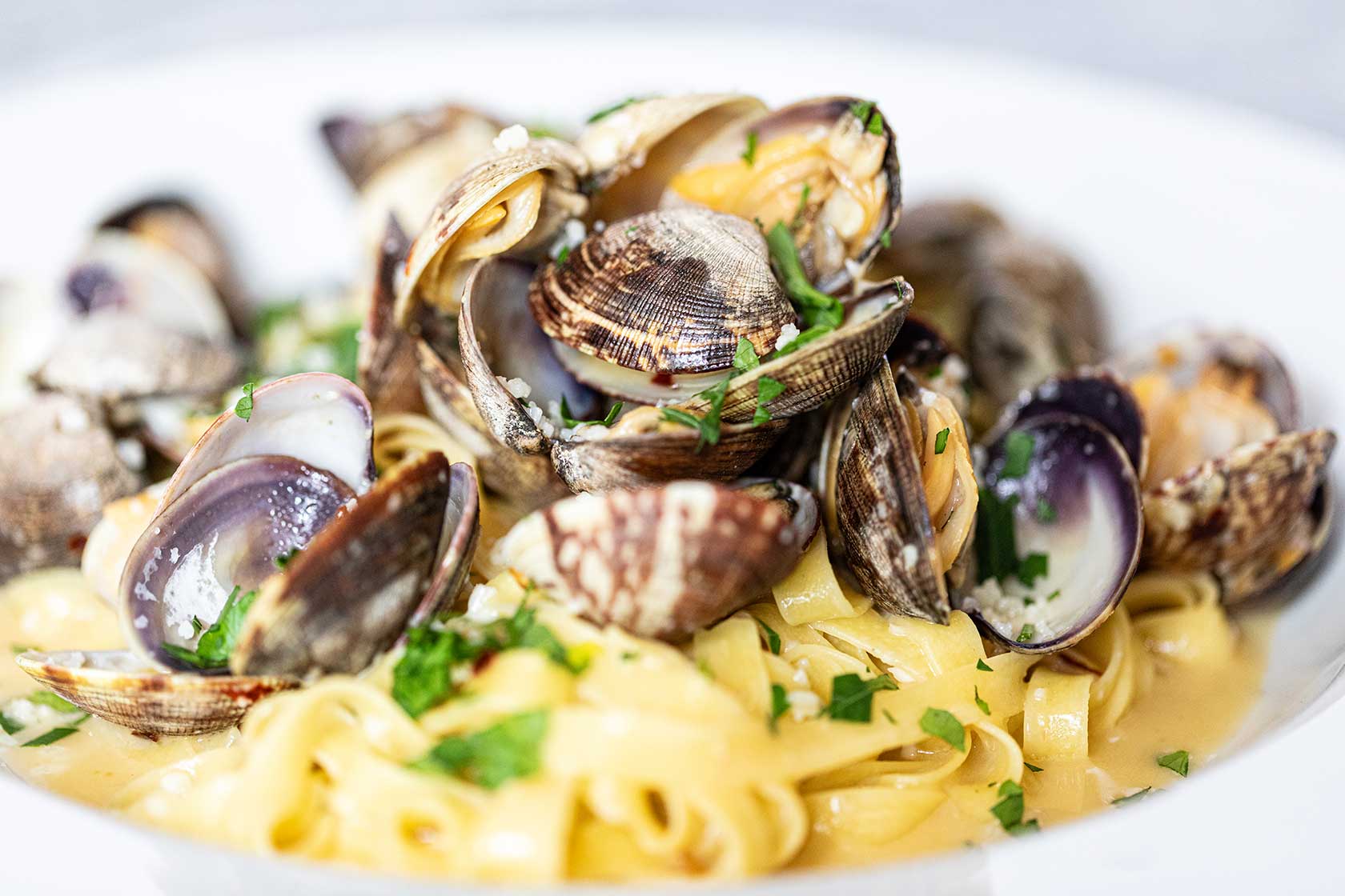 The tagliatelle shown in the video is made in-house, rolled and cut to create a broad, silky noodle designed to carry flavor without overpowering it. Tagliatelle is chosen specifically for this dish because of its ability to hold the sauce while still allowing the clams to remain the focus.